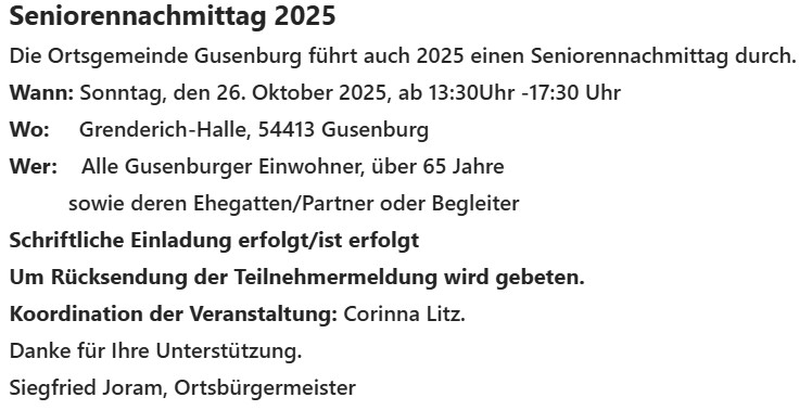 Die Ortsgemeinde Gusenburg führt auch 2025 einen Seniorennachmittag durch.